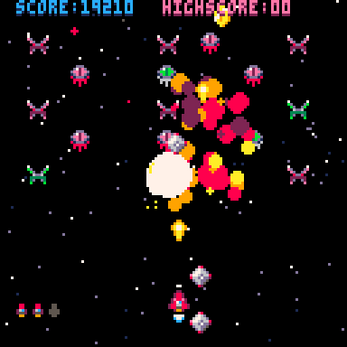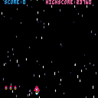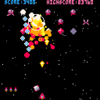 - Collect pickups from enemies (score, extra life, defensive shield)